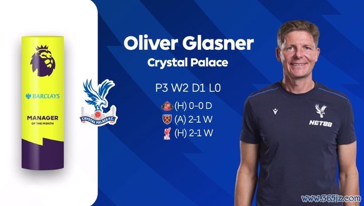 10月10日讯 奥地利籍主帅奥利弗-格拉斯纳九月率水晶宫保持不败,当选英超月度最佳主帅,生涯首获该奖项。