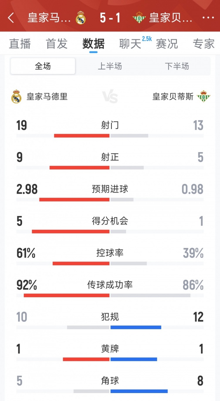 1月5日讯 在本轮西甲,皇马5-1大胜贝蒂斯,欧冠足球直播以下为双方全场数据对比: