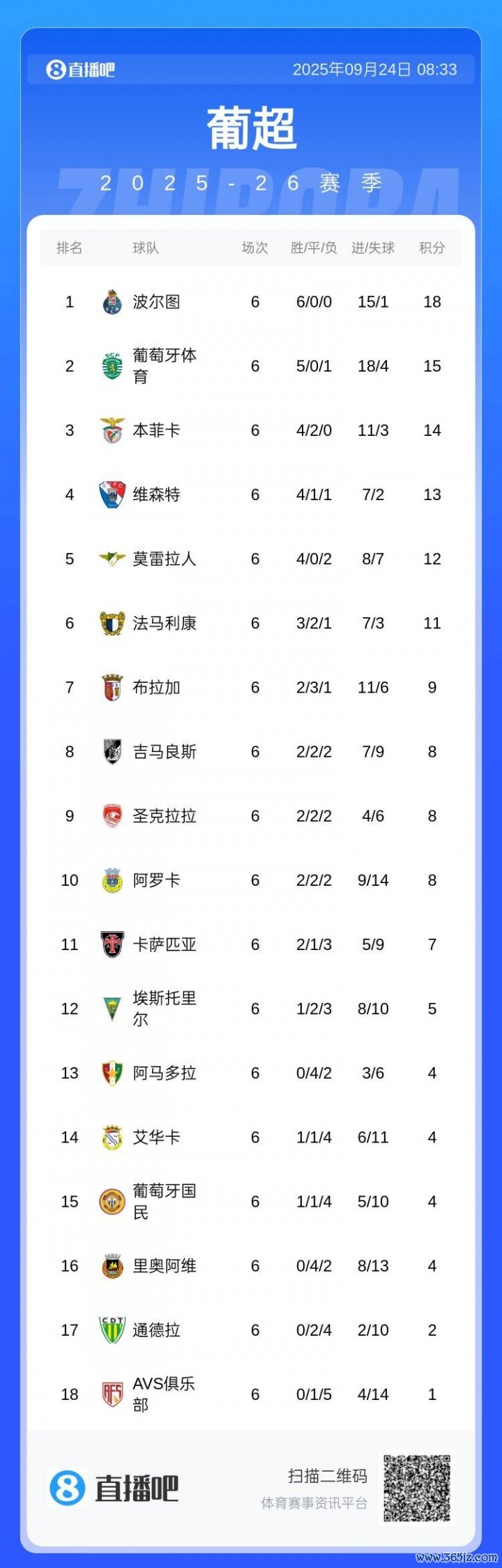 目前葡超前三由“葡超三巨头霸占”:第1是6战6胜的波尔图, 活力运动家园NBA直播18分;第2是葡萄牙体育5胜1负(负波尔图), 欧冠15分;第3是穆里尼奥执教的本菲卡,欧冠4胜2平14分。