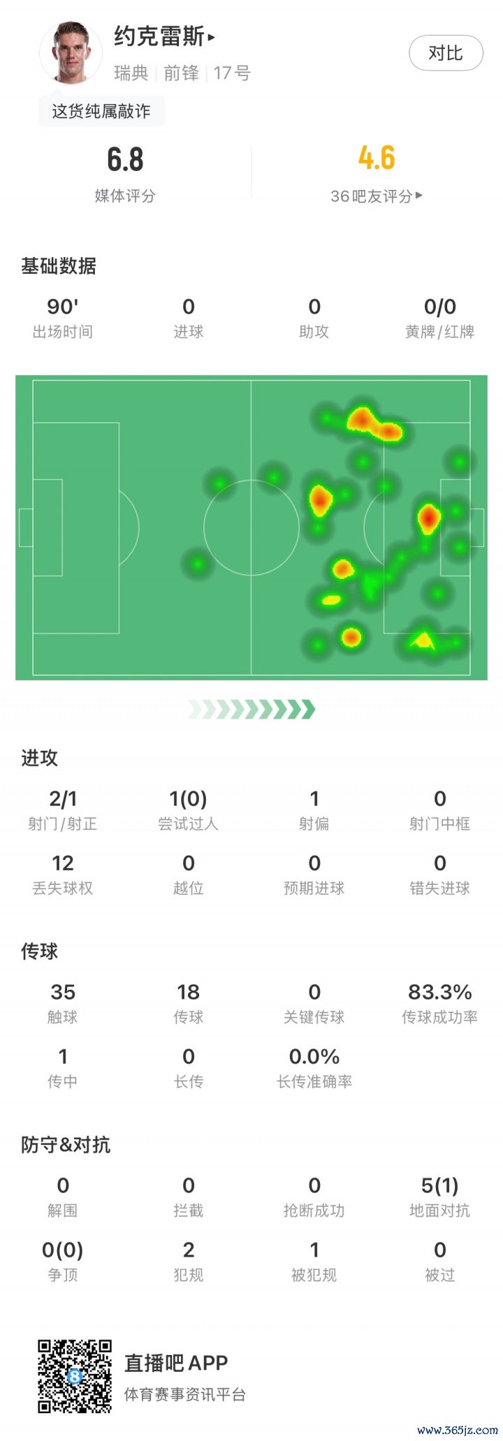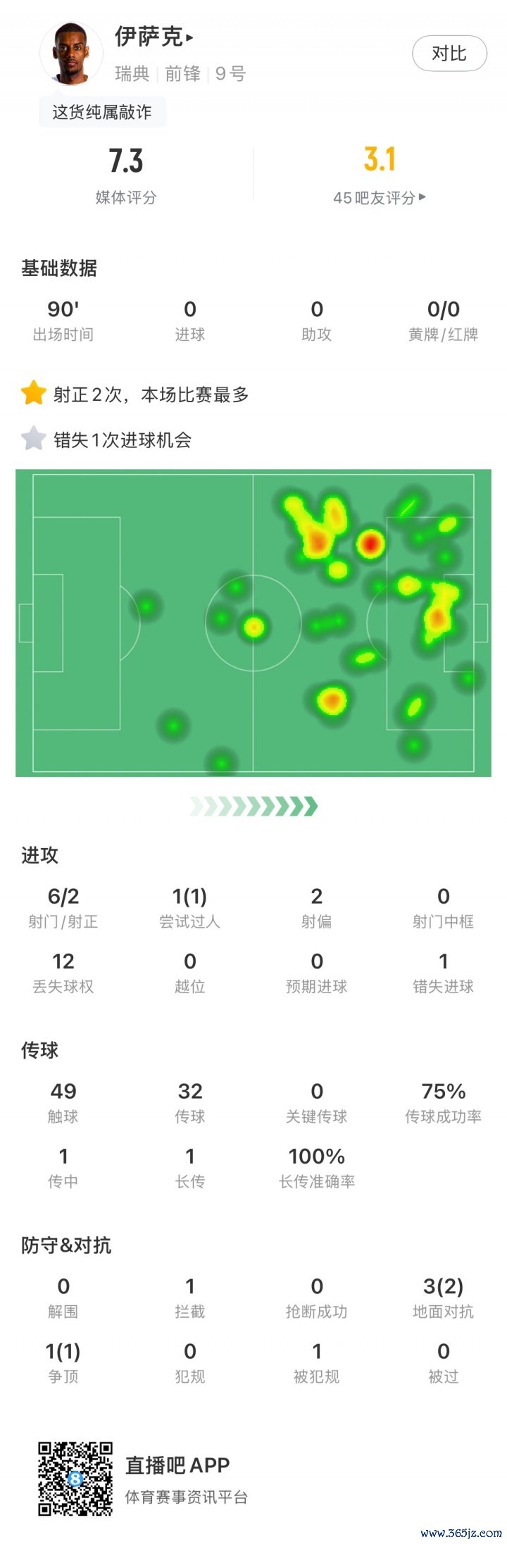 本场约克雷斯、伊萨克均首发打满全场, 活力运动家园体育直播伊萨克全场6射2正0球, 欧冠1次错失良机。约克雷斯数据为2射1正0球。
