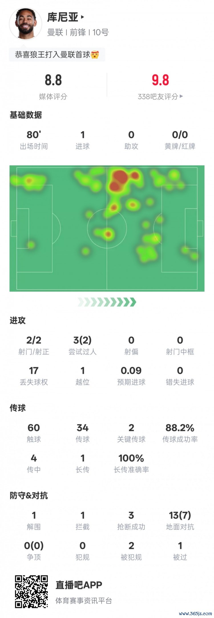 库尼亚本场数据:1进球2过人成功2关键传球,评分8.8