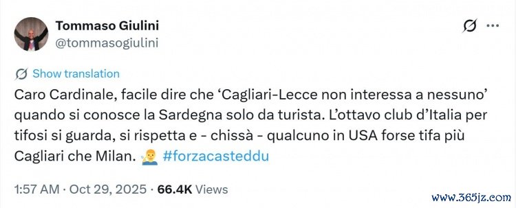 朱利尼写道:“亲爱的卡迪纳莱,当你对(卡利亚里主场所在地)撒丁岛的了解仅限于游客视角时,说‘没人关心卡利亚里对阵莱切的比赛’会很容易。作为意大利球迷数量排名第八的俱乐部24到25赛季英超赛程一览表,卡利亚里既有观众关注,也备受尊重。而且谁知道呢,在美国,或许支持卡利亚里的人比支持米兰的还多(注:在美国有很多来自撒丁岛移民的后裔)。”