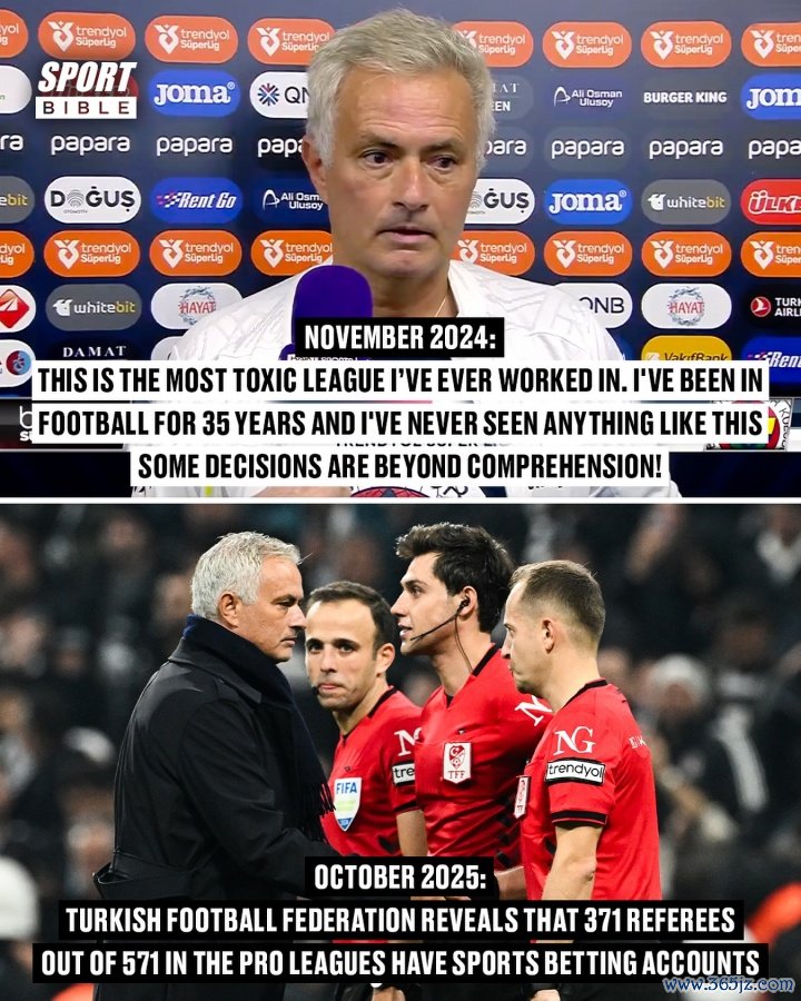 穆帅去年11月曾炮轰土超判罚,如今371名裁判被查有博彩账号