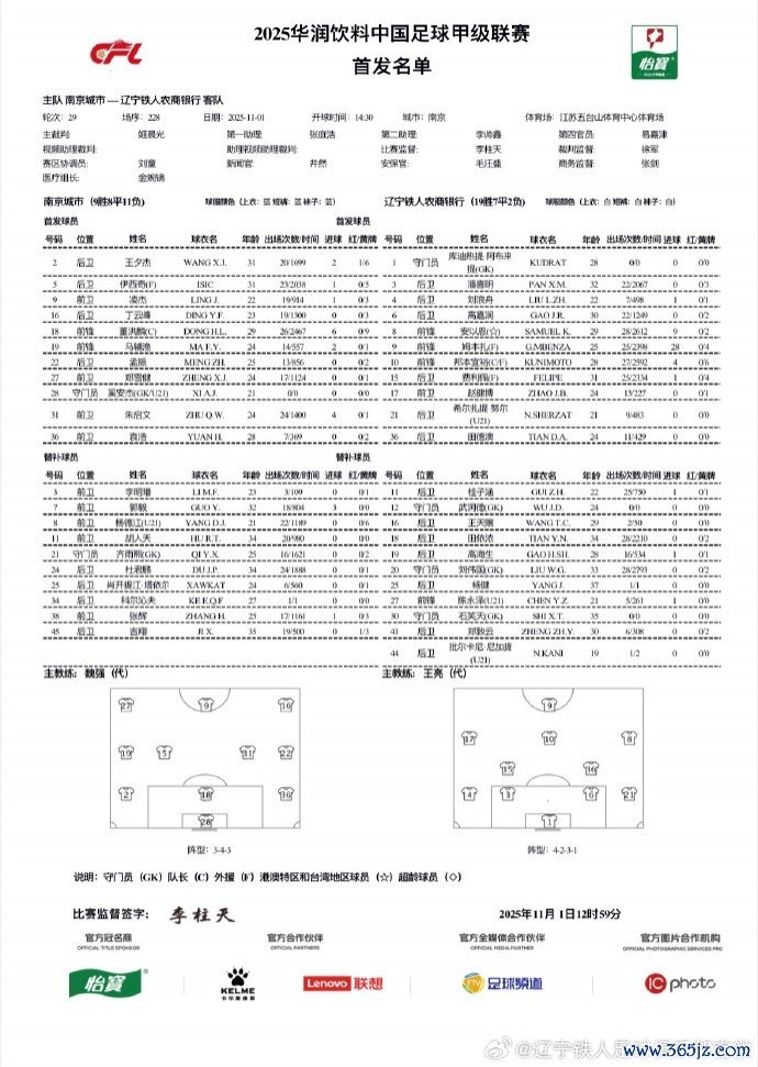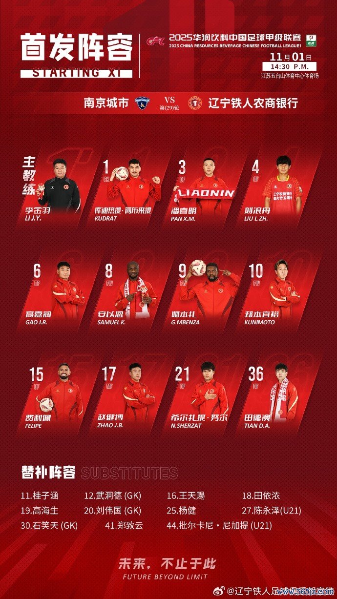 中甲第29轮,南京城市vs辽宁铁人首发名单!