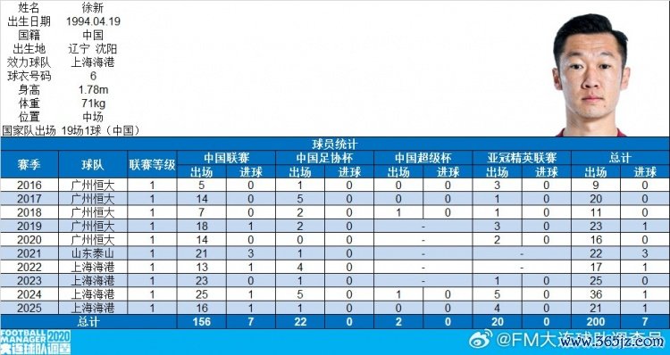 11月1日讯 中超联赛第29轮,上海海港主场3-0击败浙江队。据博主“FM大连球队调查员”统计,海港球员徐新完成代表中国俱乐部各项职业赛事出场200场,欧冠总共打入7球。