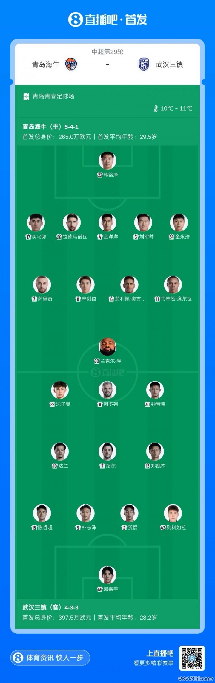 海牛保级关键战!青岛海牛vs武汉三镇首发:五外援PK四外援!
