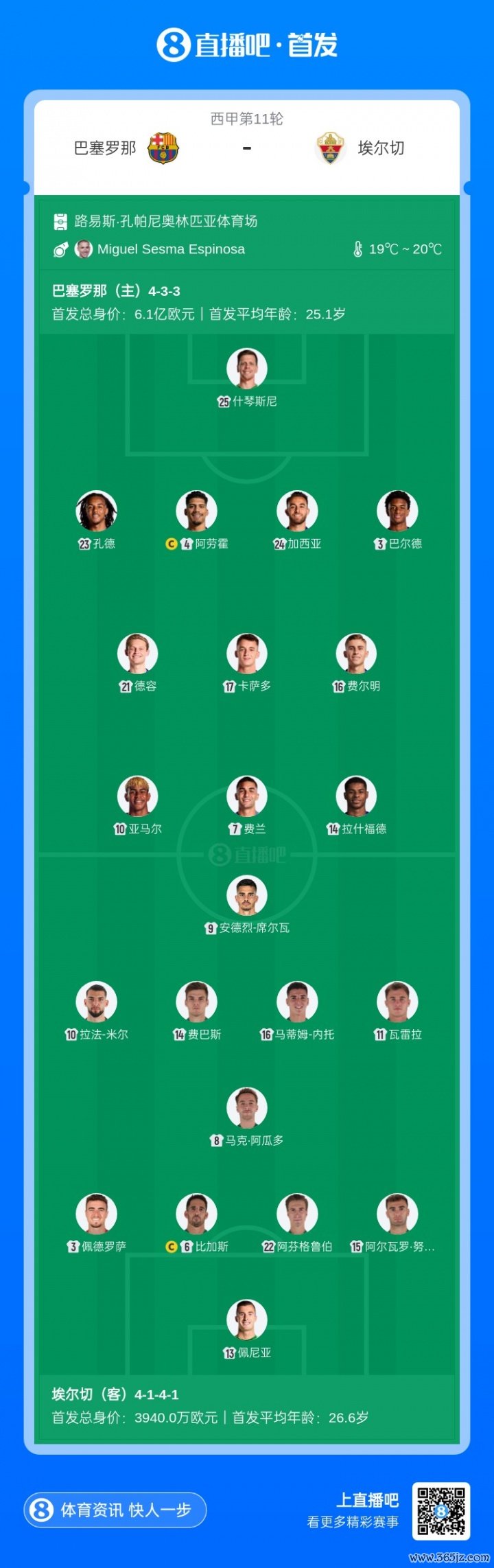 巴萨vs埃尔切首发:亚马尔、拉什福德、费兰先发,莱万复出替补