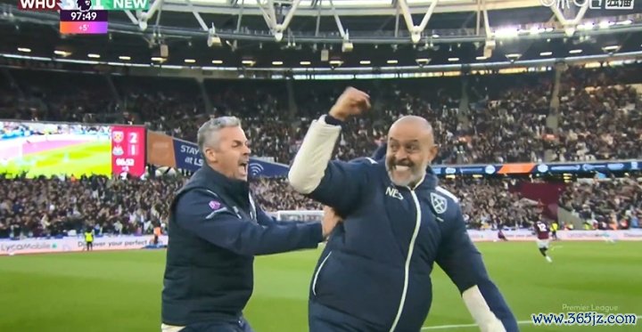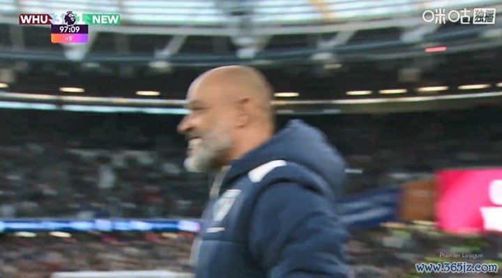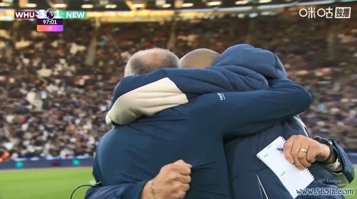 下半场补时第5分钟,欧冠绍切克补射破门帮助西汉姆锁定胜局, 活力运动家园直播吧主帅努诺在场边与教练组激动相拥。