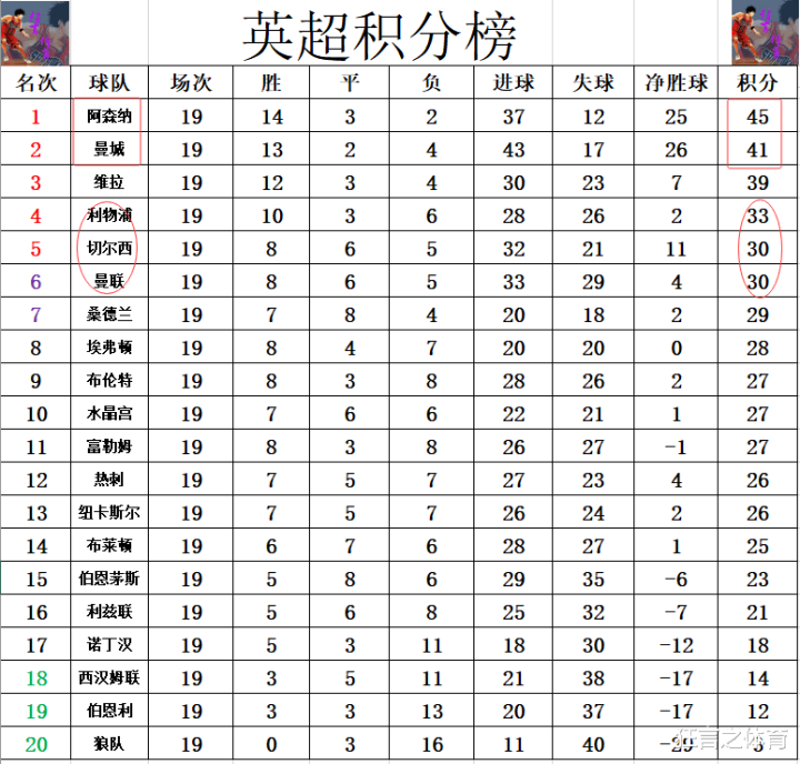 积分榜方面,阿森纳本轮是可以开心的笑了,不仅在榜首大战直接对话中击败维拉,今天曼城又被桑德兰终止了6连胜,这样的话阿森纳以4分的领跑优势夺得半程冠军。利物浦本来有机会大幅度缩小和维拉的差距,但现在的利物浦已经无法持续稳定发挥,被弱旅利兹联逼平后,落后维拉6分,多切尔西,曼联3分还是排在第4。