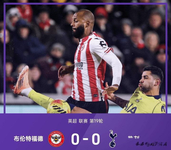 25/26赛季英超联赛第19轮,布伦特福德0-0互交白卷闷平热刺。布伦特福德开场5分钟由沙德门前补射打进一球被吹罚越位在先;罗梅罗防线最后一人解围失误放倒蒂亚戈疑似逃红;热刺小将阿奇·格雷禁区内倒地,VAR介入后裁判未判点。最终双方在新年首战握手言和。热刺近4轮仅取得1场胜利,