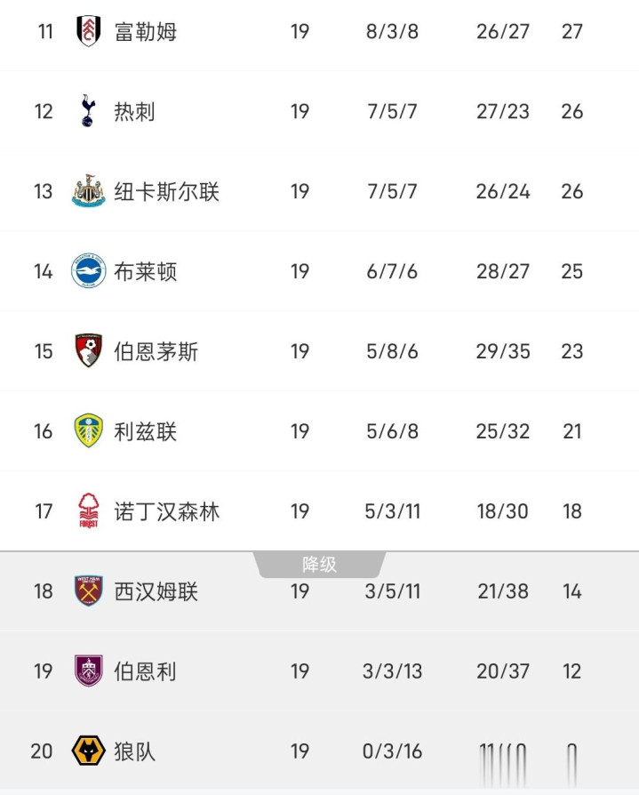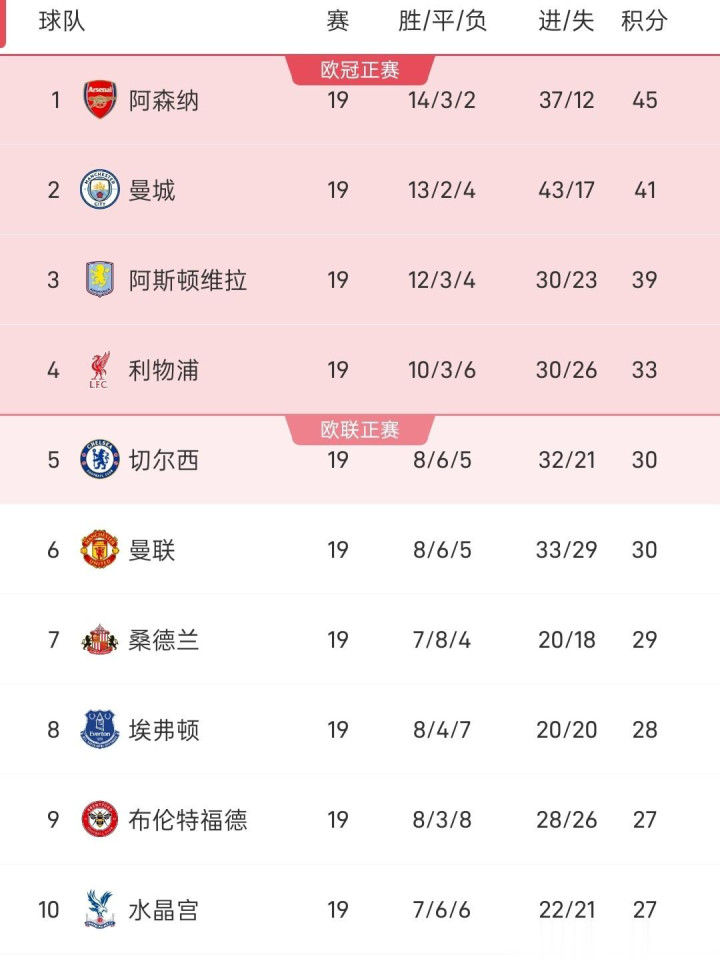 在积分方面,阿森纳45分领跑,曼城41分次席,阿斯顿维拉39分排在第3,卫冕冠军利物浦33分排在第4,切尔西,曼联30分排在第五,六名!