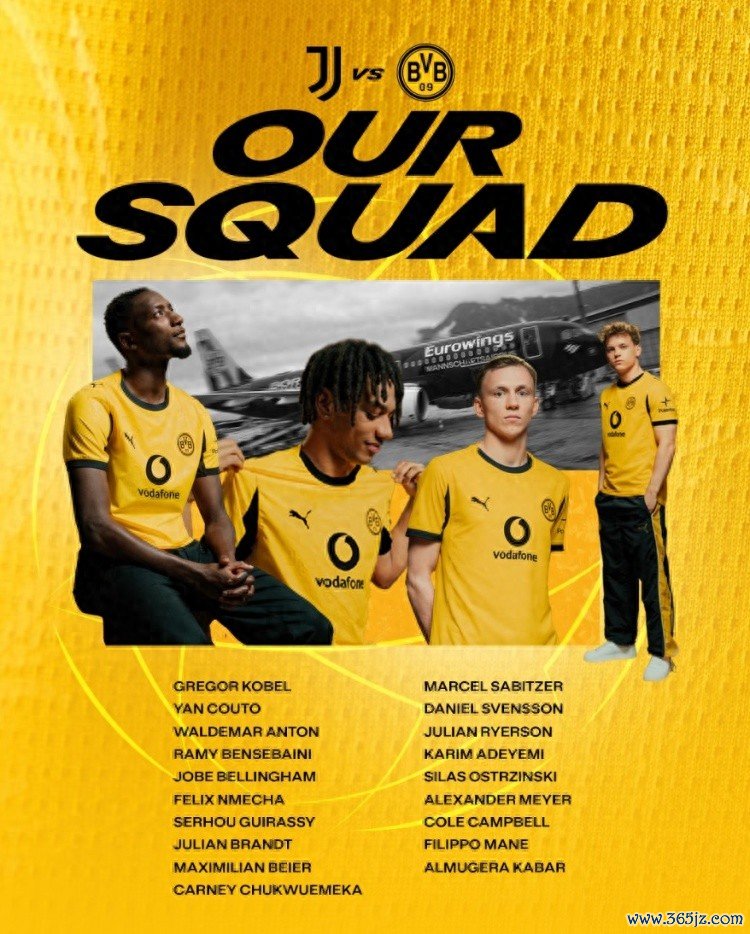 直播吧9月15日讯 欧冠职业联赛 阶段首轮赛事 ,多特将前往客场应战 应战 尤文。目前,欧冠“大黄蜂”已经公布了本场赛事 大名单, 活力运动家园NBA直播小贝林厄姆、萨比策在列, 欧冠埃姆雷-詹、施洛特贝克等缺阵。
