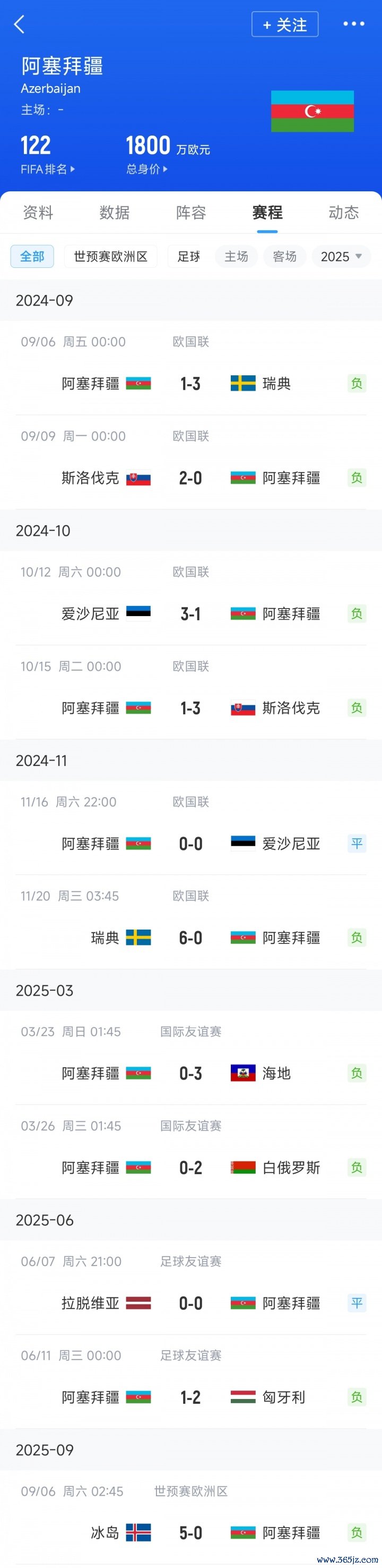 阿塞拜疆现世界排名122,在欧洲区基本是倒数。在桑托斯带队的11场赛事 中,阿塞拜疆对阵排名更低的爱沙尼亚和拉脱维亚也没能赢下,甚至告负。他们曾有过0-6瑞典的大败 、0-3海地的完败、以及几日前0-5遭冰岛痛击。