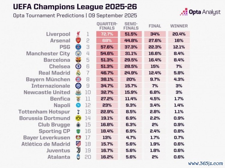 opta使用超级计算机预测本赛季欧冠夺魁 概率,利物浦20.4%为夺魁 最大热门,体育直播阿森纳16%次席,巴黎12.1%第三。