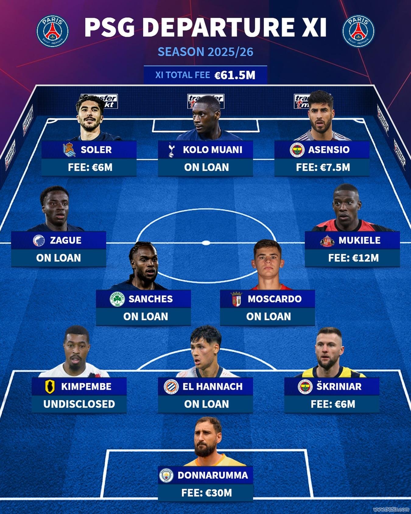 德国转会市场盘点了在今年夏天离开巴黎圣日耳曼的球员,并组成了一套11人阵形 。