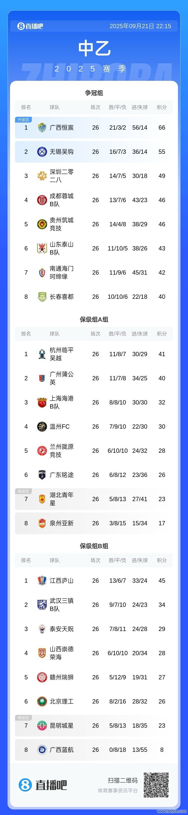 直播吧9月21日讯 中乙第26轮结束争夺,争冠组较量中,欧冠广西恒宸不敌无锡吴钩遭遇赛季第二败,