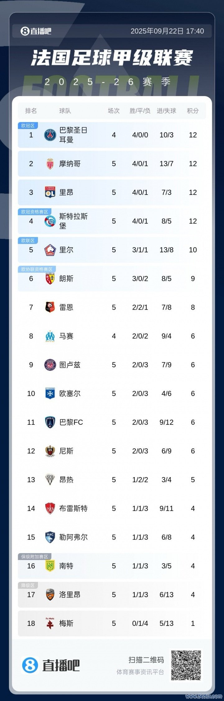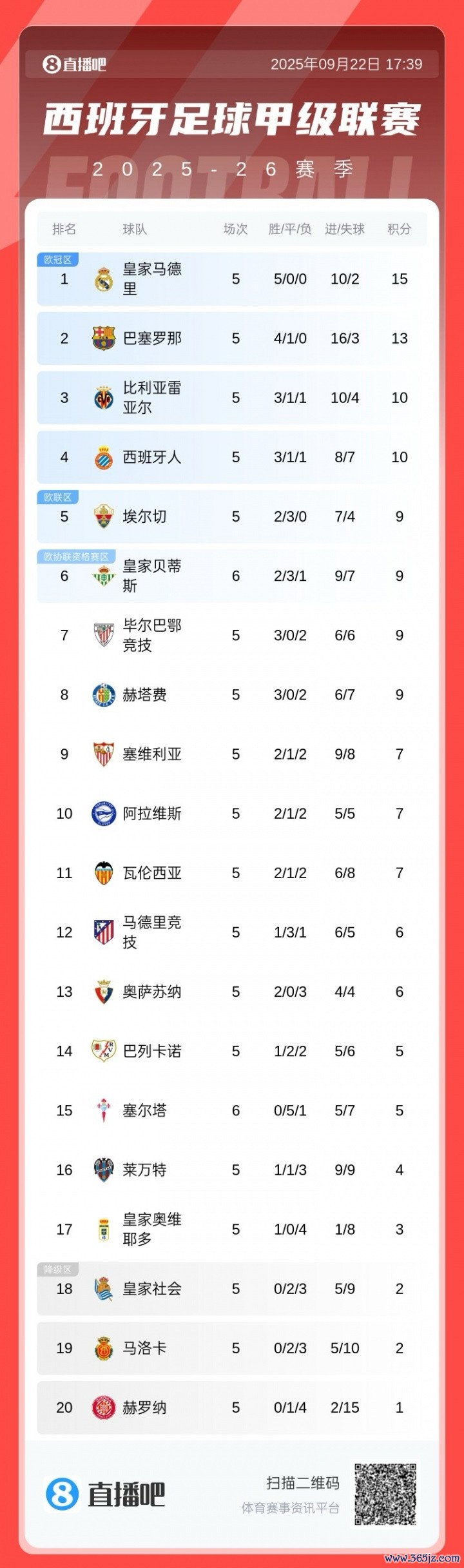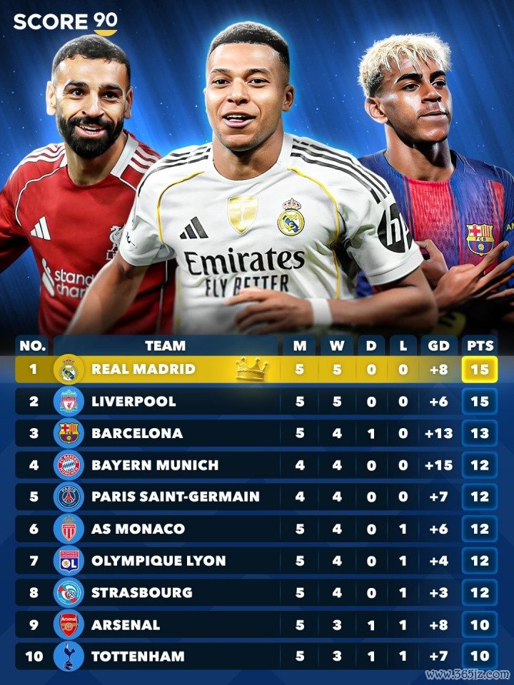 你的主队在哪? 五大职业联赛 合体积分榜: 皇马 利物浦5轮全胜领跑
