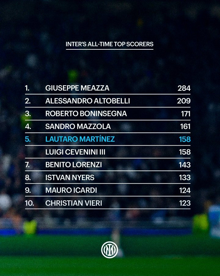 中甲2025赛季 国米队史射手榜: 劳塔罗158球升至第5位, 伊卡尔迪124球第9