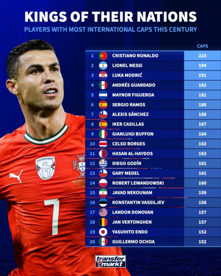 223场! C罗名列本世纪国际赛事 出场次数最多的球员榜首